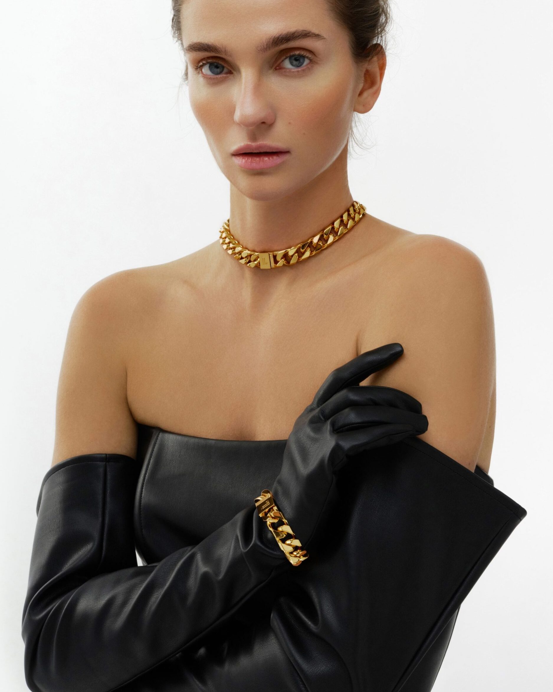 Ten choker jest ucieleśnieniem pewności siebie i wyrafinowanego smaku. Jego konstrukcja tworzy silny akcent wizualny, podkreślając piękno naturalnego wdzięku szyi. Wyrafinowany, ale z charakterem, ten…