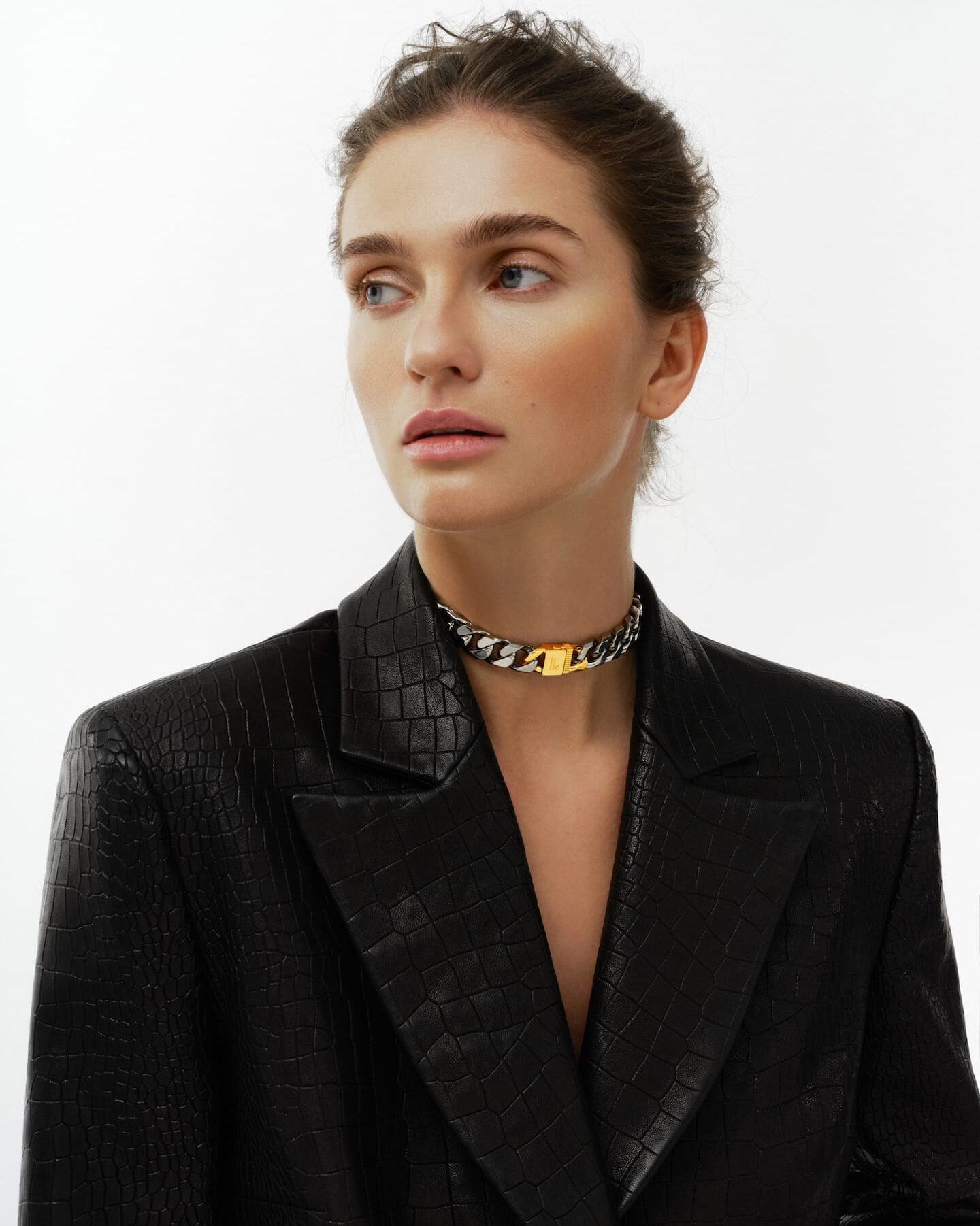 Złoty choker z karabińczykiem to siła kontrastu. Gęsty splot metalu precyzyjnie dopasowuje się do szyi, podkreślając linię sylwetki. Centralnym akcentem jest złoty karabińczyk, który brzmi jak zamknięcie opowieści, w której każdy szczegół jest przemyślany. To nie tylko zapięcie, ale symbol kontroli, niezależności i energii.