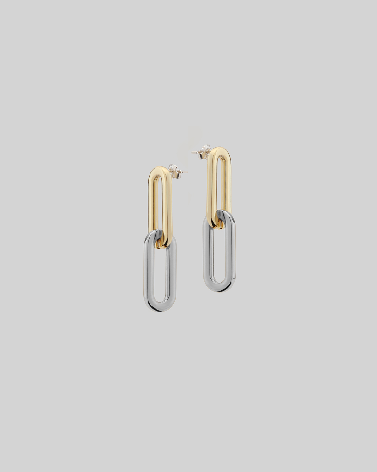 Dwukolorowe kolczyki to dialog dwóch kolorów w wyraźnej pionowej linii. Złote górne ogniwo i srebrne dolne ogniwo tworzą prostą, ale trafną kompozycję, którą można łatwo zintegrować z różnymi stylizacjami. Wydłużone kształty z delikatnymi zaokrągleniami podkreślają dekolt, a dzięki lustrzanej powierzchni współgrają ze światłem w ruchu.
