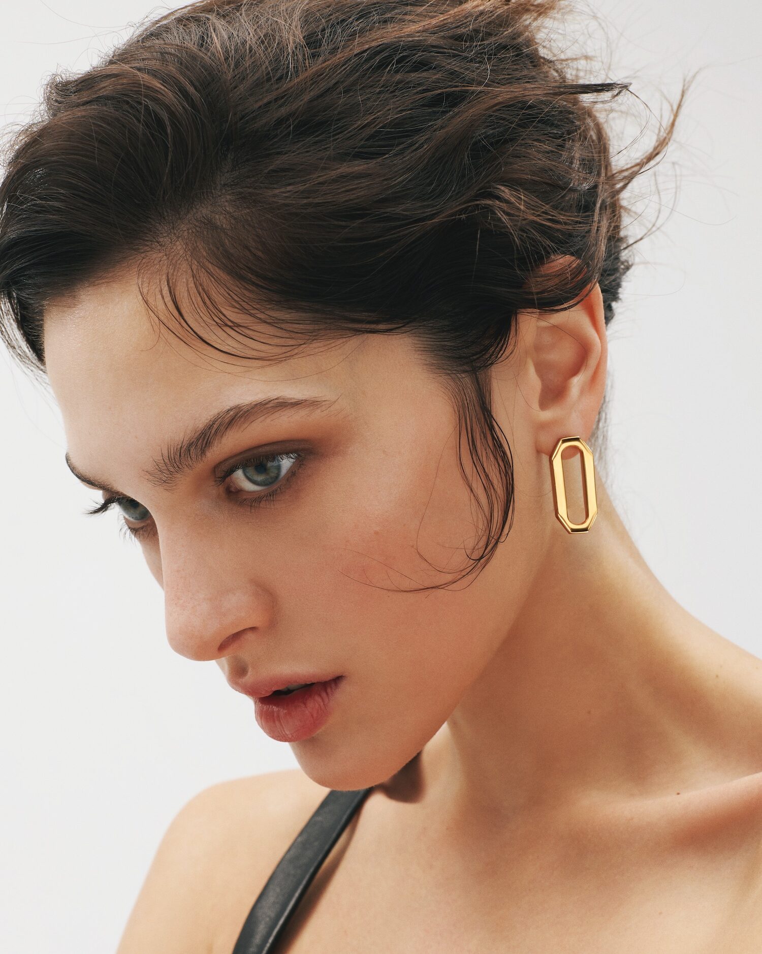 Kolczyki z pojedynczym ogniwem mają skoncentrowany kształt, który nie wymaga żadnych dodatków. Geometria sześciokąta ze ściętymi krawędziami tworzy idealną równowagę: wystarczającą objętość, aby przyciągnąć wzrok, a jednocześnie wystarczającą lekkość, aby pozostać dyskretnym.