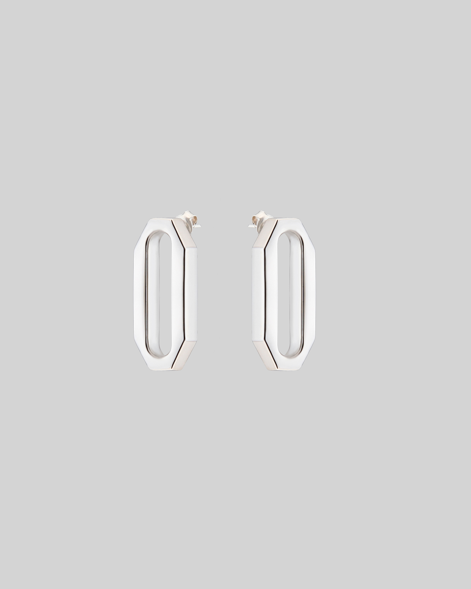 Te kolczyki to geometria precyzji w jednym ruchu. Ich kształt jest celowo oderwany, nawet trochę techniczny. Ale to właśnie nadaje im charakter. Nie zdobią – podkreślają.