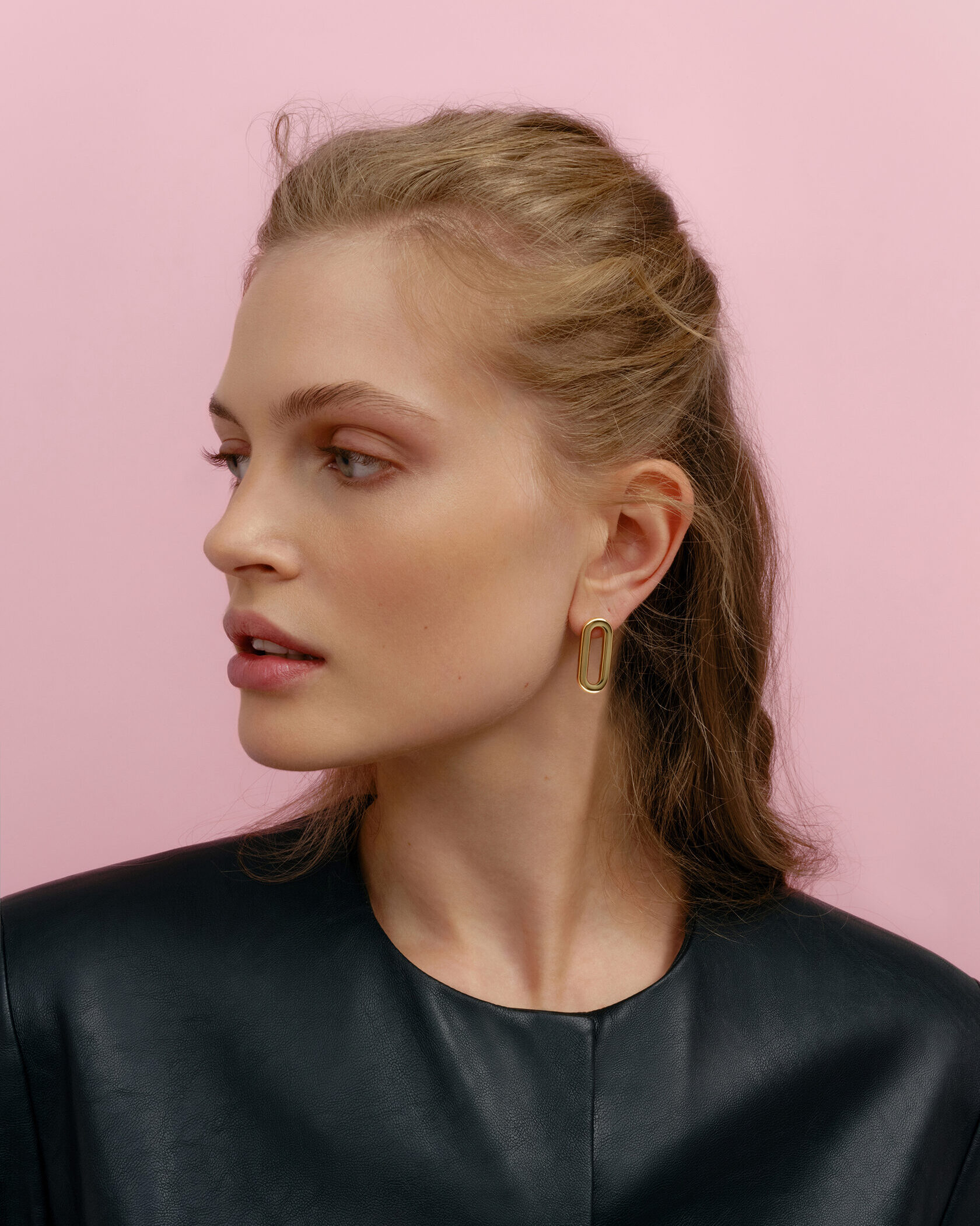 Te kolczyki to minimalistyczne rozwiązanie o znanej geometrii. Złoty kolor delikatnie gra w świetle, nie tworząc nadmiernego połysku, ale wyraźnie podkreślając kształt. Ogniwo jest wdzięcznie wydłużone, z gładkimi zaokrąglonymi krawędziami, tworząc poczucie spokojnego ruchu i precyzji.