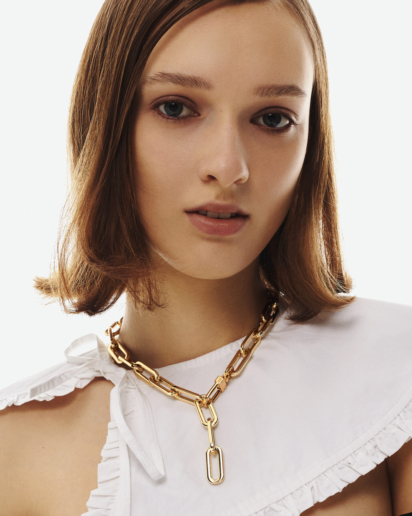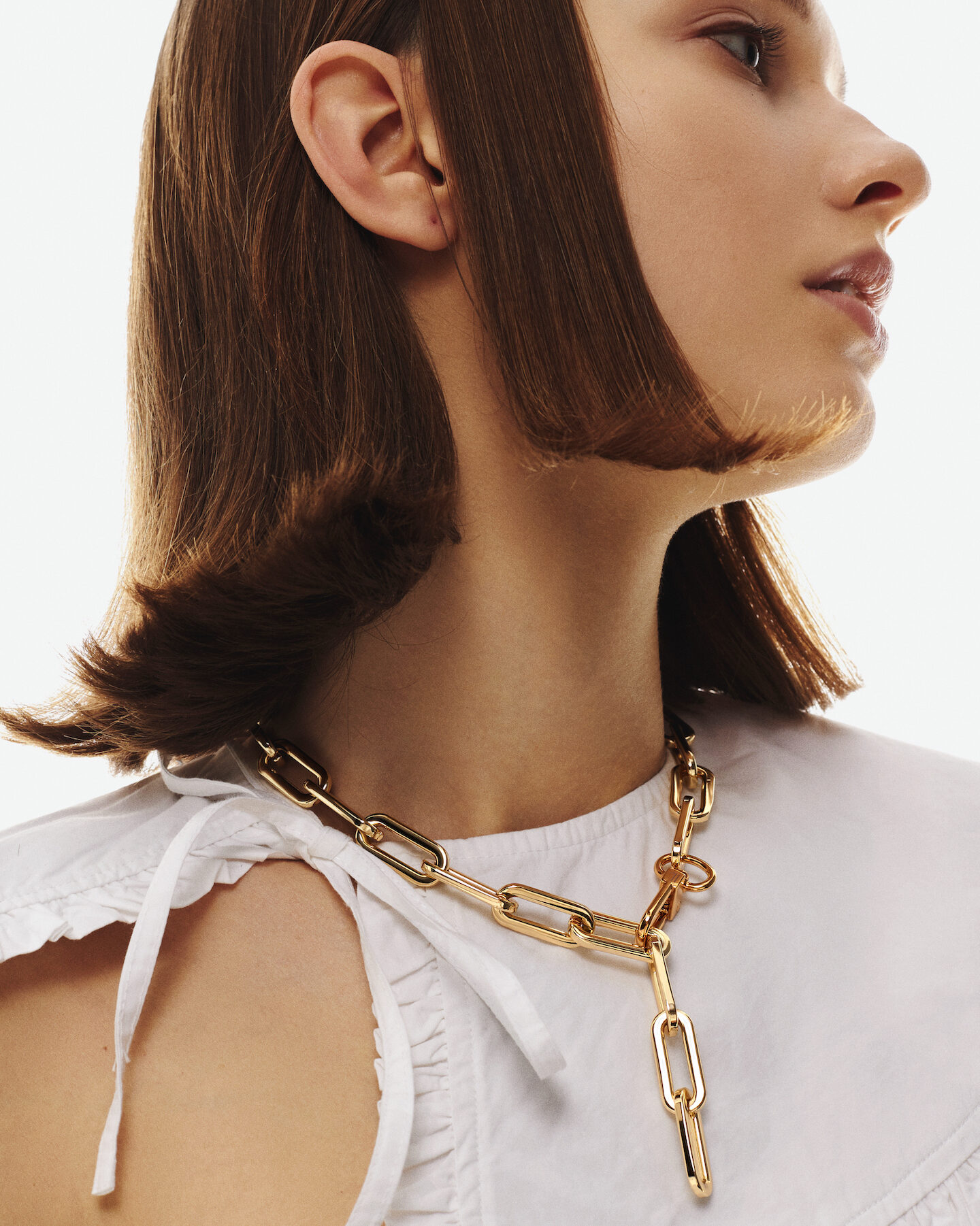 Złoty naszyjnik uosabia siłę prostoty. Z powodzeniem balansuje między architekturą a ruchem – biżuteria dopasowuje się do ciała i staje się częścią codziennego rytuału. Pasuje zarówno do klasycznych marynarek, jak i dzianin, dodając wyrazistości bez głośnych oświadczeń.