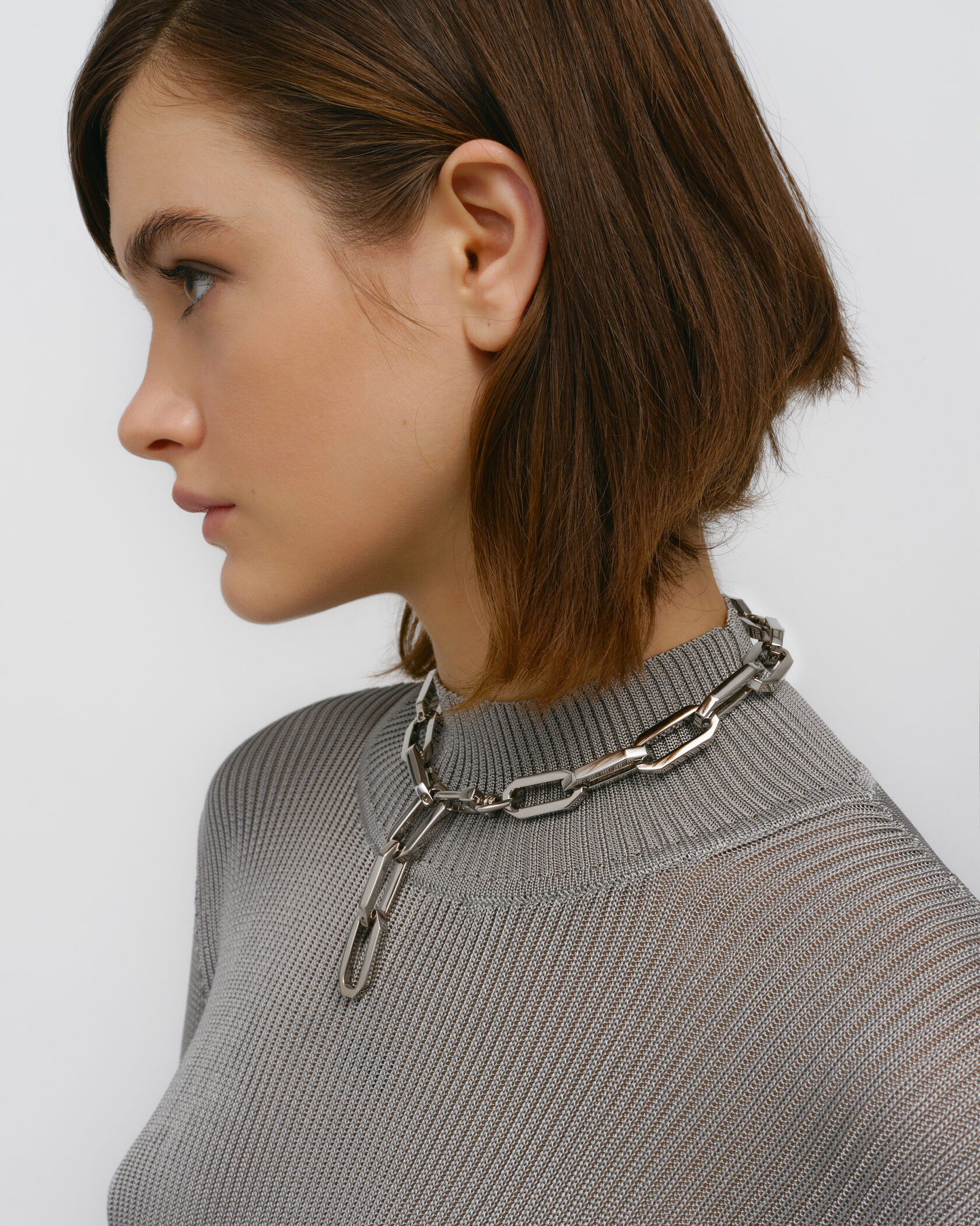 Ten naszyjnik to pewność siebie. Nie dostosowuje się do nastroju, ale go kształtuje. Jest idealny w połączeniu z odkrytymi ramionami, dzianinami, nieoczekiwanymi kombinacjami: metal i skóra, jedwab i dżins.